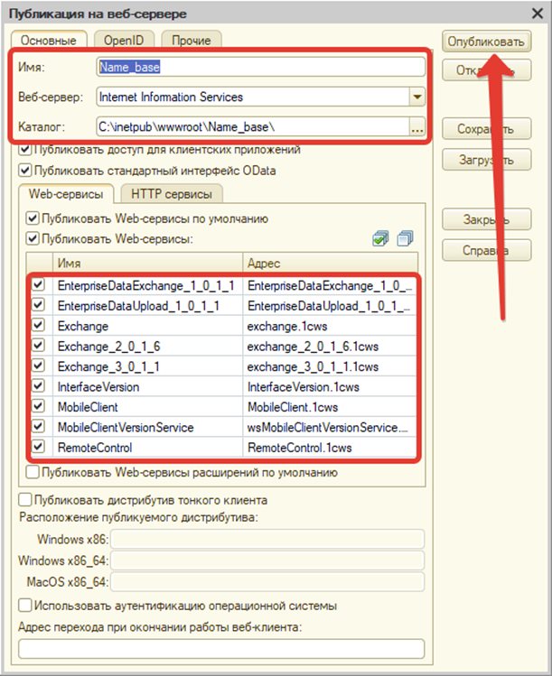 Выбираем Администрирование → Публикация на веб-сервере. В окне публикации: