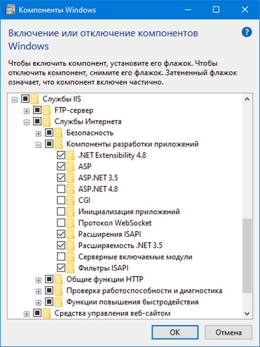 На Windows 10 путь установки немного отличается. Открываем Панель управления → Программы и компоненты → Включение или отключение компонентов Windows. Находим раздел Службы IIS и отмечаем те же компоненты.