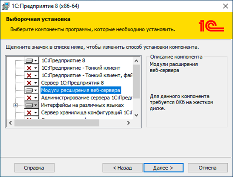 Перед публикацией базы необходимо установить платформу 1С:Предприятие на сервер, где будет размещен веб-сервер. При установке обязательно выбрать компонент «Модули расширения веб-сервера». Без этого компонента публикация не работает.