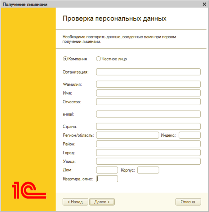 Ввод сведений о владельце лицензии. Должны быть указаны те же сведения (с точностью до символа), которые были введены при получении лицензии: